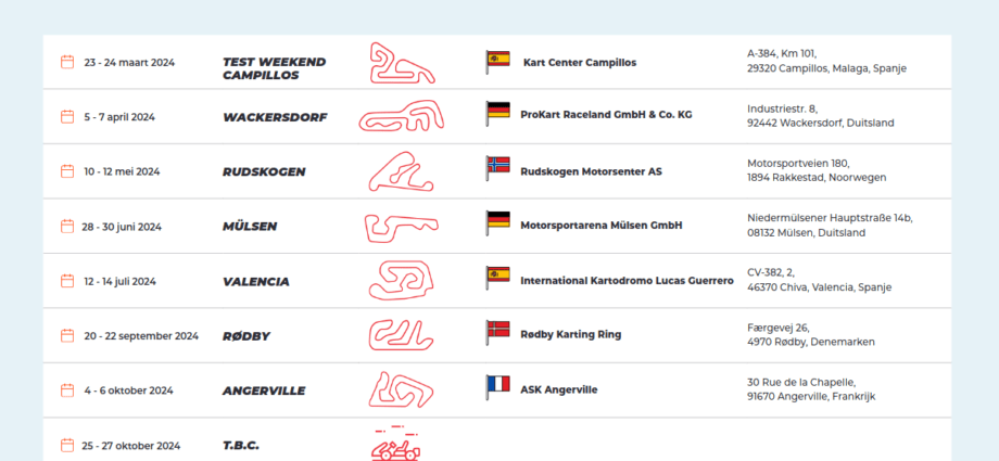 De nieuwe Karting Champions League presenteerde zijn kalender voor 2024. Voor het eerste raceweekend gaat de serie in april naar Wackersdorf in Duitsland. Dat wordt gevolgd door een weekend in Rudskogen in Noorwegen in mei, dan terug naar Duitsland (Mülsen) en nog voor de zomervakantie wordt er halverwege juli afgereisd naar Valencia in Spanje. Na de zomer gaat de Karting Champions League verder met verplaatsingen naar Denemarken (Rødby), Frankrijk (Angerville) en naar België (circuit nog te bevestigen). De finale is er in Spanje, in Campillos. Het seizoen begint met twee testdagen, ook in Spanje. De winnaar van de K2 klasse (KZ geschakeld) zal in het seizoen 2025 mogen racen in het Spaanse F4-kampioenschap met MP Motorsport, de initiatiefnemer van de Karting Champions League.