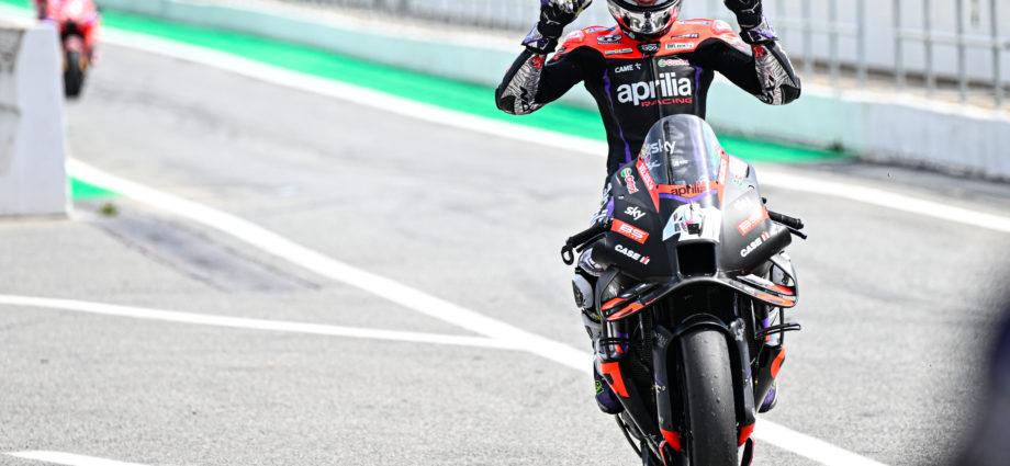 - MotoGP – Het was maar zo passend. Gisteren kondigde Aleix Espargaro aan dat hij op het einde van het seizoen de MotoGP vaarwel zegt, vandaag zaterdag pakte hij voor Aprilia dan de pole en de zege in deze sprintrace! Het werd trouwens een bewogen race waarbij zwaar slag werd geleverd voor de leiding en waarbij achtereenvolgens Raoul Fernandez (Tech3 GasGas) en dan Brad Binder (KTM) crashten vanuit de leidende positie. Vervolgens leek Francesco Bagnaia op weg naar een comfortabele zege maar ook de Ducati rijders ging in de fout en crashte uit P1… Zo kon Aleix Espargaro er een heuse thuiszege van maken! Een sterke Marc Marquez (Gresini) die in extremis nog voorbij Pedro Acosta (Tech3 GasGas) naar de tweede plaats ging, zorgde voor een volledig Spaans feestje.