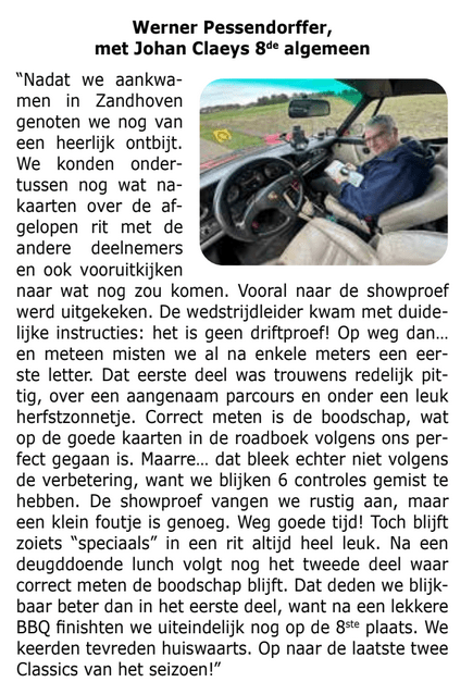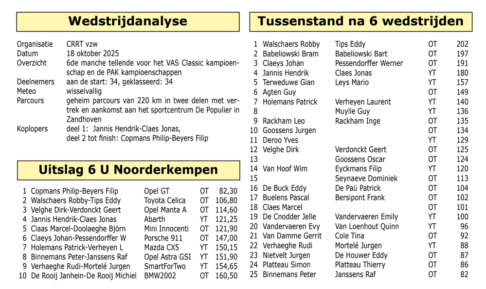 Als het tweede deel van de wedstrijd al iets duidelijk maakte, dan was het dat de “noorderkempen” blijkbaar vooral een kolfje naar de hand zijn van de ervaren ploegen, de routiniers, de voormalige winnaars… Al wilden Wim Van Hoof en Filip Eyckmans met de Subaru Impreza ST, deze stelling graag ontkrachten. Zij scoorden een ongelooflijke 0,80 punten en waren daarmee met voorsprong de besten van deel twee. Maar ze kreunden onder een zware puntenlast uit het eerste deel en dus vielen ze ondanks de mooie score buiten de strijd om zege of ereplaatsen. Achter hen kwamen de door de wol geverfde duo’s opzetten met Robby Walschaers en Eddy Tips (Toyota Celica), Copmans en Beyers, Pascal Buelens en Frank Bersipont (Volvo Amazon), Dirk Velghe en Geert Verdonckt op de Opel Manta A (winnaars in 2024) en nestor Eddy De Buck, op de Mazda MX5 bijgestaan door de ervaren Patrick De Paü. Buiten Eyckmans en Van Hoof pakten alle deelnemers gemiste controles in deel 2. Andere vaststelling, op tijd haalde bijna niemand strafpunten.