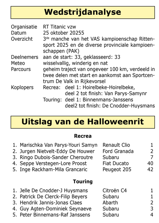 Op zaterdag 25 oktober zakten 33 teams af naar het rustige Rijkevorsel om er deel te nemen aan de tweede Halloweenrit, de voorlaatste manche van het toch wel uitgedund Rittensportkampioenschap van de VAS. Inderdaad, met het wegvallen van de Gapersrit in en rond Wervik zullen de fanaten van bolleke-pîjl, visgraat en kaartfragmenten het moeten doen met vier events waarvan de Tieltse Nachtravenrit op 13 december het sluitstuk zal vormen.
