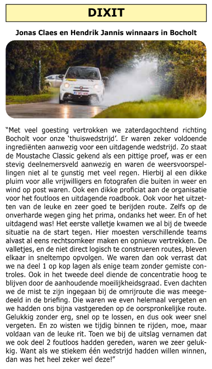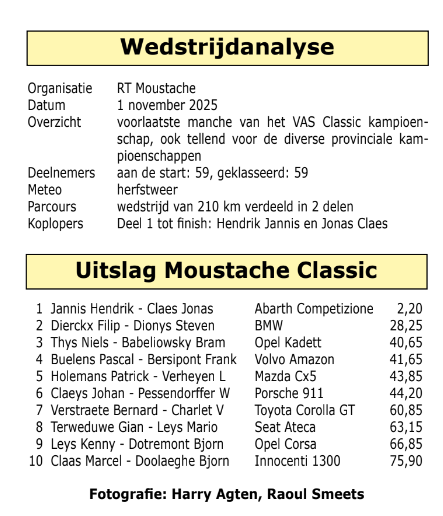 Zaterdag 1 november was er in en om Bocholt de Moustache Classic. Een gerenommeerde navigatiewedstrijd die elke deelnemer graag op zijn palmares zou willen. Het Classic kampioenschap loopt ook naar zijn einde toe en voor de concurrenten met titelambities, lagen er dan weer andere kansen te wachten. Een samenvatting van een mooie wedstrijd.