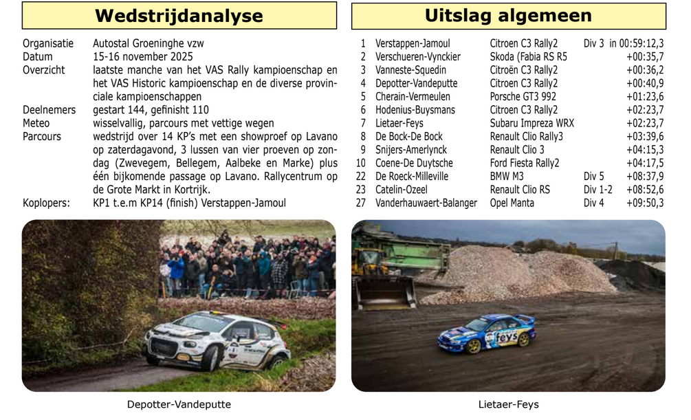 Keren we nog even terug naar de wedstrijd, en dan vooral naar de pechvogels. Velen zagen Patrick Snijers in een glansrol met de Porsche GT3. Echter, nog voor de start stelde men een olielek vast op de Duitse machine. “De Lange” besloot dan om met corijdster Amerlynck, over te stappen op een Renault Clio Rally3. Dat Snijers nog steeds aan een stuur kan draaien bewees zijn negende plaats algemeen. Hij moest wel stuurkunstenaar Tim Van Parijs, ook op Clio Rally3, voor zich dulden in de klasse 3G. Van Parijs kwam op een achtste plaats binnen. Bjorn Syx kon toch wat verhopen, zeker met co Vanrobaeys op Toyota Yaris GR Rally2. Maar twee lekke banden in de openingsfase op zondag, sloegen hem ver terug. Met een herstart in Super Rally kon Syx nog het potentieel van de Yaris bewijzen, maar door het tijdsverlies zat er niet meer in dan een verre 94ste plaats. En Cedric Cherain? Die liet zich bij tijden opmerken met de Porsche GT3, maar het wisselvallige herfstweer, samen met de vettige baantjes rond Kortrijk, beperkten zijn mogelijkheden. Hij kwam niet verder dan een vijfde plaats.
