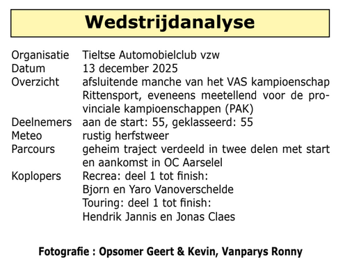 De klasse “Touring” dan. Hier zagen we opnieuw een spektakelrit van Hendrik Jannis en Jonas Claes op de Abarth Competizione. Zij deelden al in het eerste deel een zware klap uit aan de concurrentie, met een score van slechts één punt op deel 1. Ondanks de 40 punten die ze achteraf raapten op het tweede deel, kon niemand hen meer bijhalen. Net als een week geleden in de Sinterklaas Nocturne en VAS Classic, sloten Jannis en Claes seizoen 2025 in Wingene af met een zege…en de kampioenschapstitel, deze keer in de rittensport. Achtervolgers en titelconcurrenten Guy Agten en Dominiek Seynaeve (Nissan Silvia) keken na deel 1 al aan tegen een achterstand van 44 punten! Na deel 2 en met 84 punten in totaal, geraakten zij niet verder dan een tweede plaats en… het vicekampioenschap! En wat dan met de andere titelaspiranten? Jelle De Cnodder en Jonathan Huysmans kwamen in Wingene aan als puntenleiders in het klassement. Echter vier gemiste controles in het eerste deel en wat tijd, kostten hen 88 punten! Na het tweede deel, waarin er nog twee controlebordjes werden overgeslagen en nog wat tijd werd geraapt, viel het zware verdict in de uitslag: een zevende plaats met 128 punten. Zij dienden deze zevende plaats ook in te leveren als schrapresultaat, en verloren zo alle hoop op de titel. Geert Verdonckt en Patrick De Pau (Mazda CX-5) pakten in Wingene de derde plaats, voor TAC thuisrijders Karel en Korneel Vandoorn (Volvo). Vader en dochter Luc en Tasha Van den Bogerd sloten het seizoen af met een vijfde plaats, en die bezorgde hen een derde plek in het kampioenschap.
