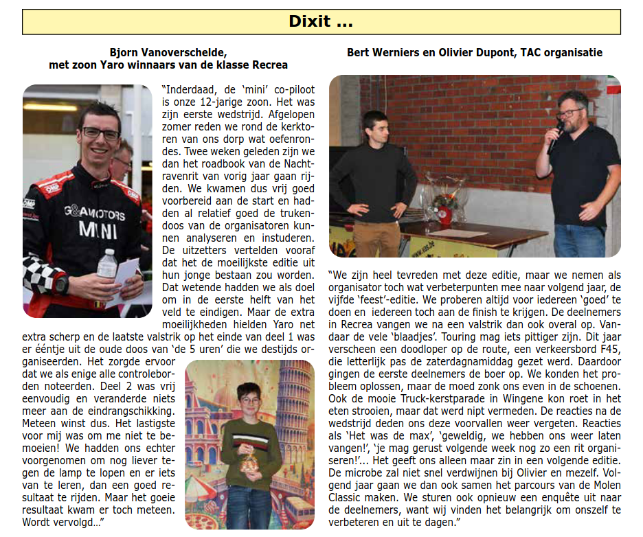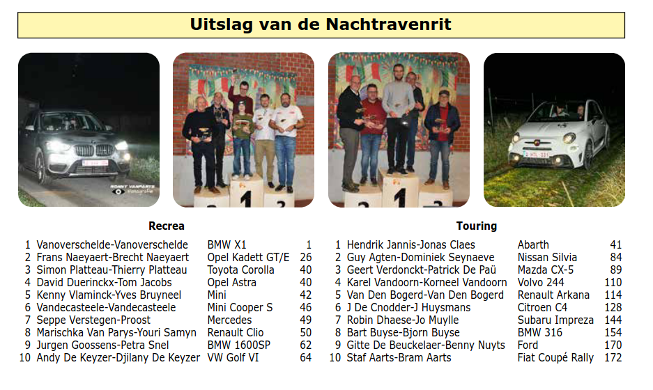 Bij de instapklasse “Recrea” ging de zege naar een duo onder dagvergunning. Maar wat voor duo! Met de naam Vanoverschelde op het inschrijvingsformulier, wisten de concurrenten alvast waar ze aan toe waren. Bjorn Vanoverschelde, een icoon in de wereld van de navigatiesport, ging van start met de piepjonge Yaro Vanoverschelde in de navigatiestoel van de BMW X1. “Een mini-copiloot met een maxi resultaat”, schreef Bjorn nadien op zijn Facebookpagina, en dat vatte het allemaal zowat samen. Het vader-zoon duo meldde zich bij het tussenpunt aan zonder één enkele gemiste controlebordje, ze raapten een enkel puntje op tijd, maar lieten zich nadien niet meer verrassen. Een perfecte nulscore in het tweede deel bezorgde hen de overwinning met een ongelooflijke score van… één punt. De rest van het podium bleef ook een familie-aangelegenheid. Frans en Brecht Naeyaert zetten de Opel Kadett GT/E op de tweede plaats, met een gemist controlebordje en een puntje op tijd, goed voor 26 punten. De derde podiumtrede dan, die ging naar Simon en Thierry Platteau, die zich aanmeldden met 40 punten op de Toyota Corolla.
