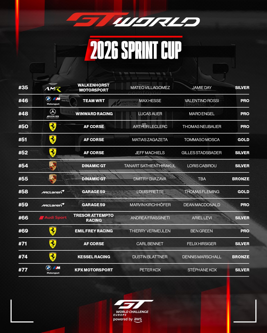 De deelnemerslijsten voor de GT World Challenge Europe Endurance Cup en Sprint Cup zijn bekend gemaakt, met niet minder dan tien merken. 45 wagens verschijnen in de Sprint Cup aan de start, 59 in de Endurance Cup. De Belgische inbreng is stevig, met drie teams, met name Team WRT, Boutsen VDS en Comtoyou Racing, en twaalf rijders in Endurance en zeven in Sprint. De Endurance Cup trapt het seizoen op 11 april in Paul Ricard af.