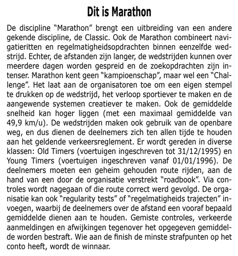 Er kan worden ingeschreven in twee categorieën. In “Marathon” worden de meer ervaren deelnemers verwacht. Er is ook een voorwaarde voor de deelnemende wagens, die moeten gebouwd zijn voor 1996! Binnen de categorie zal er gewerkt worden met de tijdsopname van Geodynamics. Het systeem maakt het mogelijk om heel wat meer kilometers op “regularity trajecten” te voorzien. Die zullen gescheiden blijven van de secties waarop de navigatie primeert. In Marathon worden de “expert” navigatiesystemen gehanteerd: bol-pijl (met en zonder afstanden), ingetekende kaarten, horloge-systeem, eenvoudige pijlen en puntenrit en geschreven nota’s.