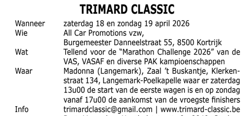 Op zaterdag 18 en zondag 19 april is er de 7de editie van de Trimard Classic. De wedstrijd, een organisatie van ACP vzw, is de openingsmanche van de VAS Marathon Challenge.