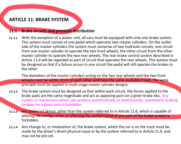 Na de Grote Prijs van België vaardigde de F1 commissie een regelwijziging uit, met onmiddellijke ingang, waarbij voorgoed komaf wordt gemaakt met de mogelijkheid van “asymmetrisch remmen”. Vanaf de Grote Prijs van Nederland mag er geen enkel systeem, mechanisch of softwarematig, meer in gebruik zijn waardoor de remkracht oneven kanLees verder