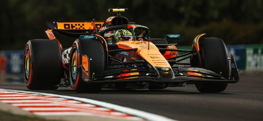 Lando Norris (McLaren) was de snelste tijdens de eerste vrije training voor de Grote Prijs van Hongarije. Hij was een honderdste sneller dan zijn ploegmaat Oscar Piastri (McLaren). Charles Leclerc (Ferrari) werd derde. Foto: McLaren McLaren zette de toon tijdens een rustige trainingssessie. Lando Norris noteerde de snelste tijdLees verder